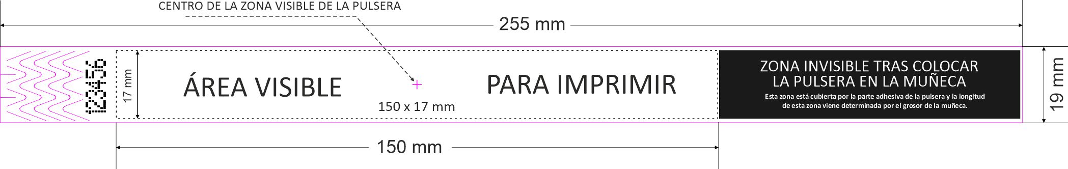 Al planificar la impresión, debe tener en cuenta que después de colocar la pulsera en el brazo, la parte derecha de la pulsera quedará cubierta . La parte visible está aproximadamente a 14 cm de la izquierda de la parte adhesiva.